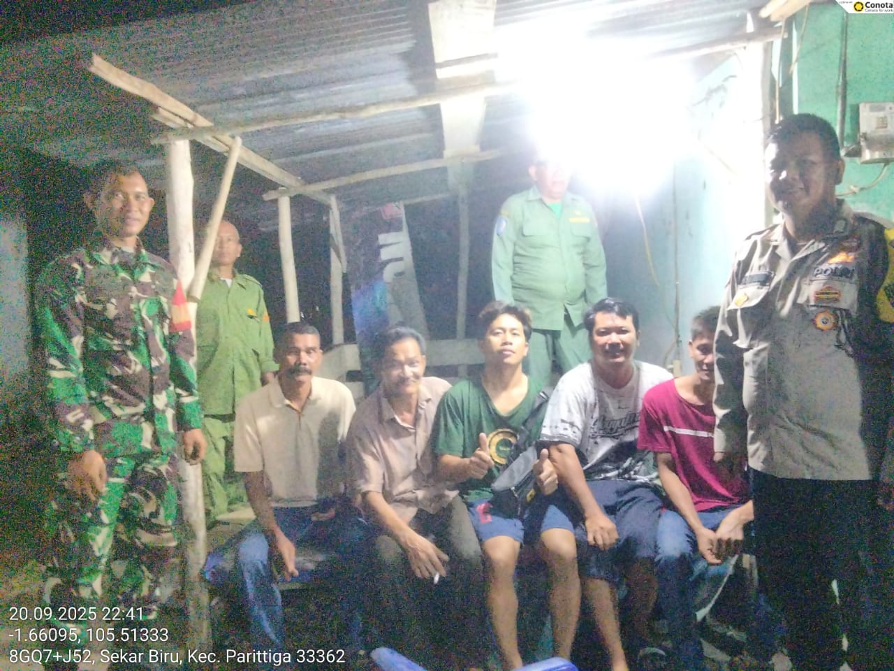 Kabar Jurnalis Babel- Parittiga Bangka Barat–Dalam rangka menciptakan situasi kamtibmas yang aman dan kondusif di wilayah Desa nya, Kepala Desa Sekar Biru beserta perangkat, Kadus, Rt, Linmas dan didampingi Babinkamtibmas dan Babinsa melakukan giat Siskamling. Sabtu Malam 20/09/2025.