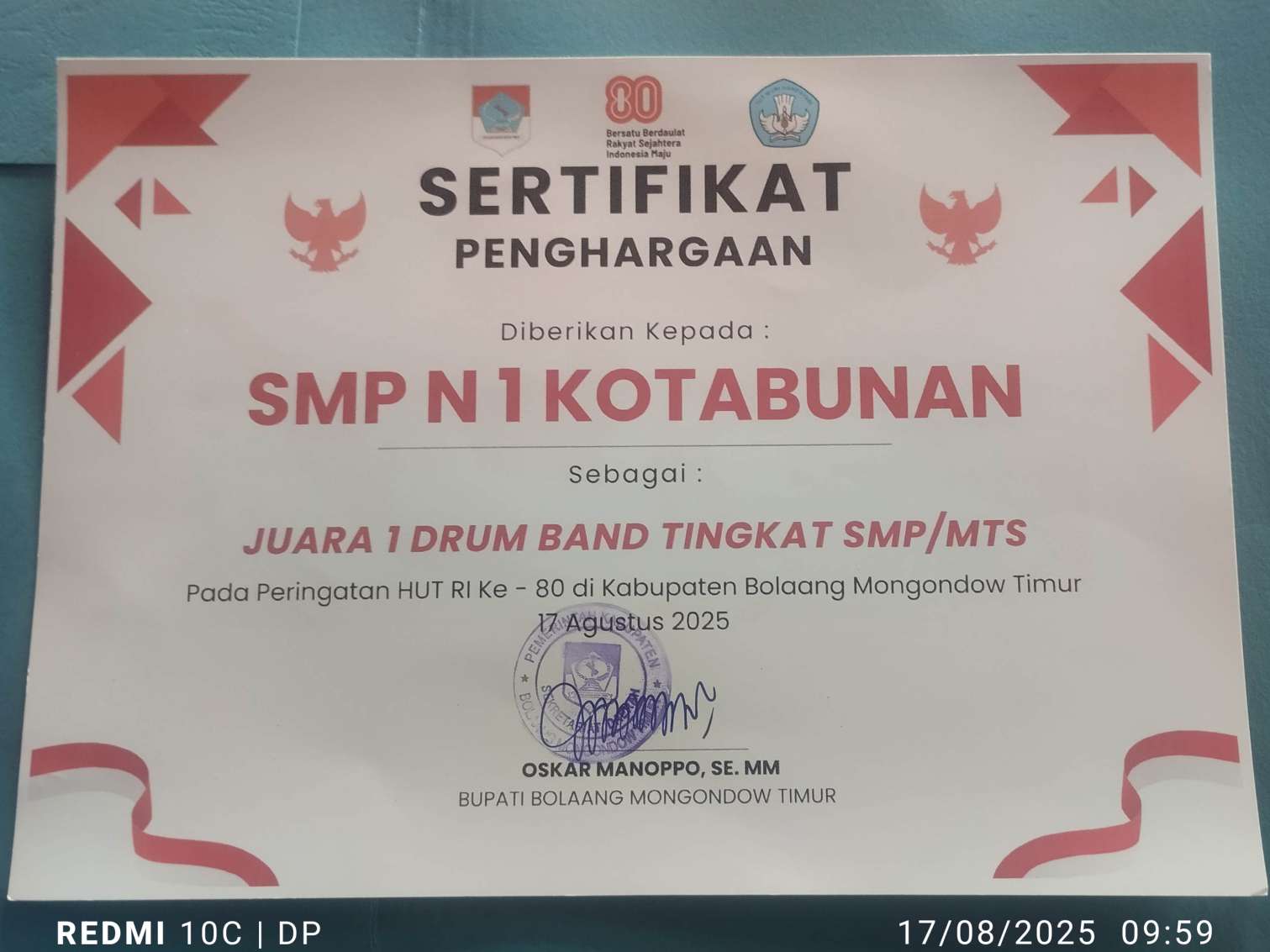 TUTUYAN — SMP Negeri 1 Kotabunan, Kecamatan Kotabunan, Kabupaten Bolaang Mongondow Timur (Boltim), berhasil meraih juara 1 pada lomba drum band tingkat SMP/MTs se-Boltim yang digelar sejak 1 Agustus 2025.